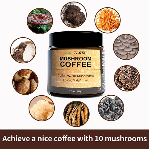 Here is our 10 mushrooms coffee. We make our mushroom coffee by using the whole fruiting bodies. Mushroom coffee can be made by medicinal mushrooms rather than culinary mushrooms. We add 10 mushrooms extract powder into the Arabica coffee to boost your daily energy.